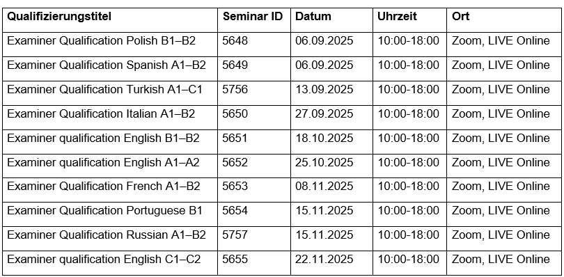 Die telc bietet in verschiedenen Fremdsprachen Qualifizierungen für Prüfer*innen mit ausgelaufener Lizenz bzw. für angehende Prüfer*innen ohne Lizenz an. In der Übersicht können Sie die Herbsttermine einsehen und sich bei Interesse über das Buchungsportal anmelden. Weitere Infos zur Prüferqualifizierung befinden sich im telc-Infoblatt.